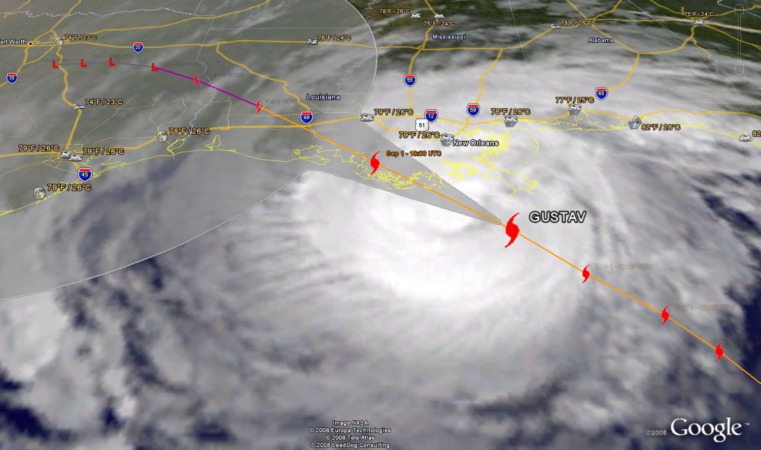 Hurricane Gustav continues its march to the Louisiana coast Monday morning with landfall expected sometime between 5:00am and 7:00am MDT. At 5:00am MDT the eye of the hurricane was approximately 85 miles south of New Orleans and about 150 miles southeast of Layfayette moving at 16 mph. Current tracks have it making landfall in the Terrebone / Lafourche areas, just to the east of New Orleans.