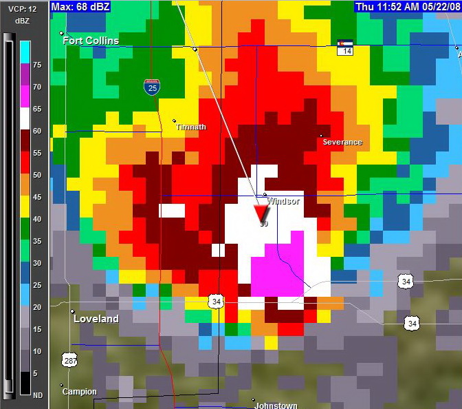 Windsor tornado radar image.At about 11:20am ThorntonWeather.com radar began to pick up rotation in the skies just south and west of Greeley. Within minutes, we were tracking what was to be this deadly and damaging tornado and at 11:50am radar (image at left) showed the twister virtually on top of Windsor. The National Weather Service is evaluating damage from the storm but early estimates place it as an EF-2 or EF-3 on the Enhanced Fujita Scale which would have generated wind speeds between 111mph and 165mph.