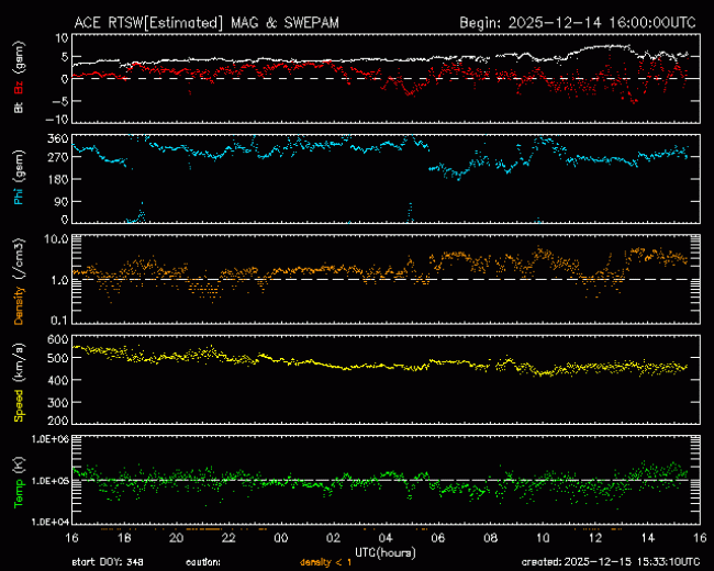 The greatest observed 3 hr Kp over the past 24 hours was 2 (below NOAA Scale levels). The greatest expected 3 hr Kp for Dec 15-Dec 17 2025 is 3.67 (below NOAA Scale levels).