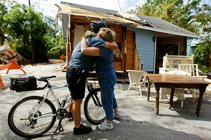 Seabrook, TX police officer Jeff Galyean hugs his 4th grade teacher, Sue Harral, on Tuesday in front of her home.  The house was swept into the middle of the street and was several hundred feet from its foundation.  Mark Wilson / Getty Images