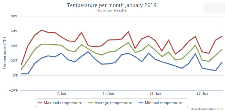 Thornton’s overall average temperature for the month came in at 34.1 degrees. This is well above the long term Denver average for January of 30.7 degrees. As usual, the Mile High City’s official reading at Denver International Airport came in warmer than us at 34.6 degrees.