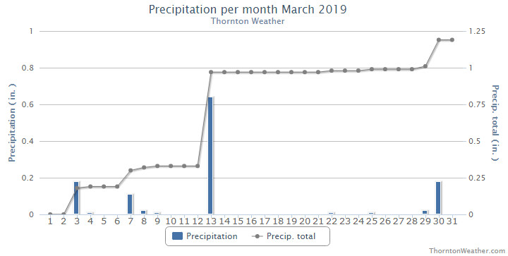 Thornton’s average temperature for the month came in at 29.9 degrees. This was a good ways below Denver’s long term average for February of 32.5 degrees. Out at Denver International Airport where the Mile High City’s official measurements are taken, it actually was colder with an average of 28.1 degrees.