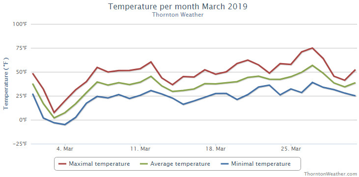 Storm systems did move through Colorado and the Rocky Mountain region and while the high country saw plenty of snow, these storms evaded the Front Range for most of the month. Temperatures were never particularly warm but overall, the average temp was warmer than normal in Thornton.