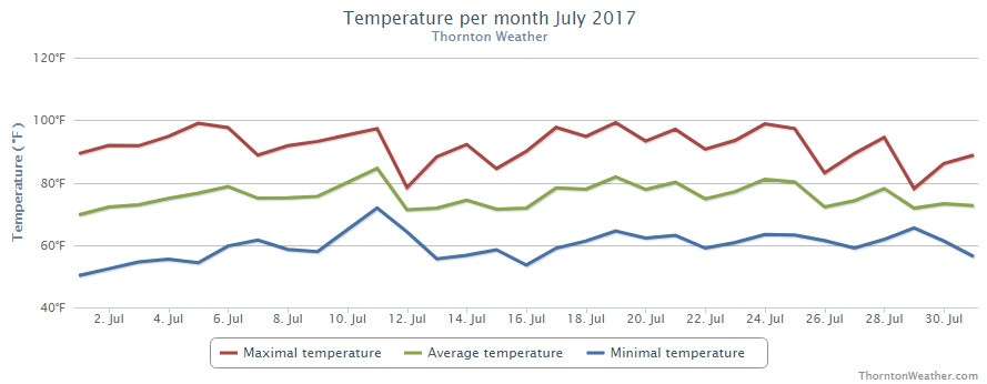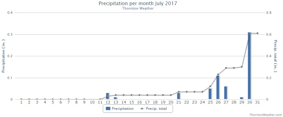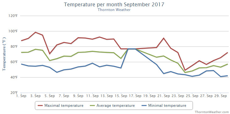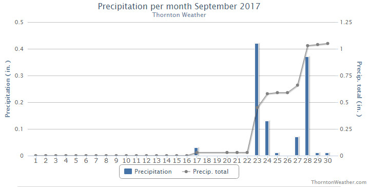 Temperatures in Thornton ranged from a high of 83.6 degrees on the 29th down to our coldest reading of 22.1 degrees on the morning of the 6th and the 7th. Denver’s maximum and minimum were similar with 83 degrees on the 29th and 21 degrees on the 6th.