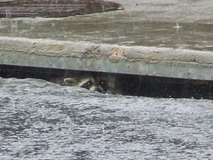 A racoon takes shelter in a storm drain at 120th & Colorado Blvd. Image courtesy 9News.com.