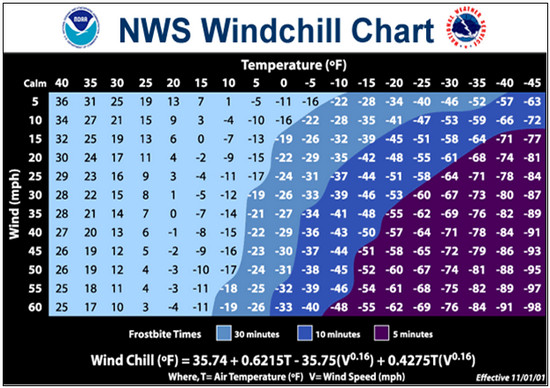 Extremely cold air comes every winter in at least part of the country and affects millions of people across the United States. The arctic air, combined with brisk winds, can lead to dangerously cold wind chill values. The Wind Chill Index helps you determine when dangerous conditions develop that could lead to frostbite or hypothermia. It takes into account heat loss from the human body to its surroundings during cold and windy weather. The calculation utilizes wind speed in miles per hour and temperature in degrees Fahrenheit. For example, a temperature of minus 5 degrees occurring with a 20 mph wind gives a wind chill near minus 30 degrees. This means that your body will lose heat at the same rate as it would if the air temperature were minus 30 degrees with no wind. Wind Chill values near minus 25 degrees mean that frostbite is possible within 15 minutes.