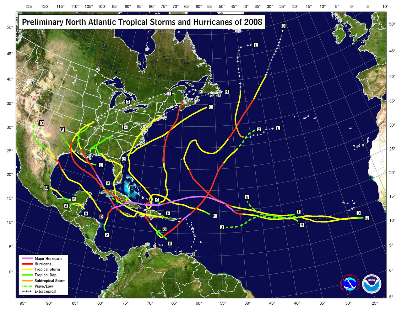This image shows the tracks of hurricanes that occurred during the 2008 season. Click for larger image.