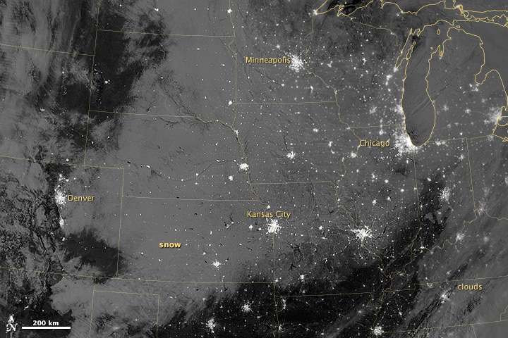 City lights glow like clusters of stars against a backdrop of grey and black in this image. The snow appears medium gray, and stretches from northern Texas to the Dakotas,and from the Rocky Mountain states eastward past Chicago. When VIIRS acquired this image, snow cover across multiple states had persisted since theprevious night.