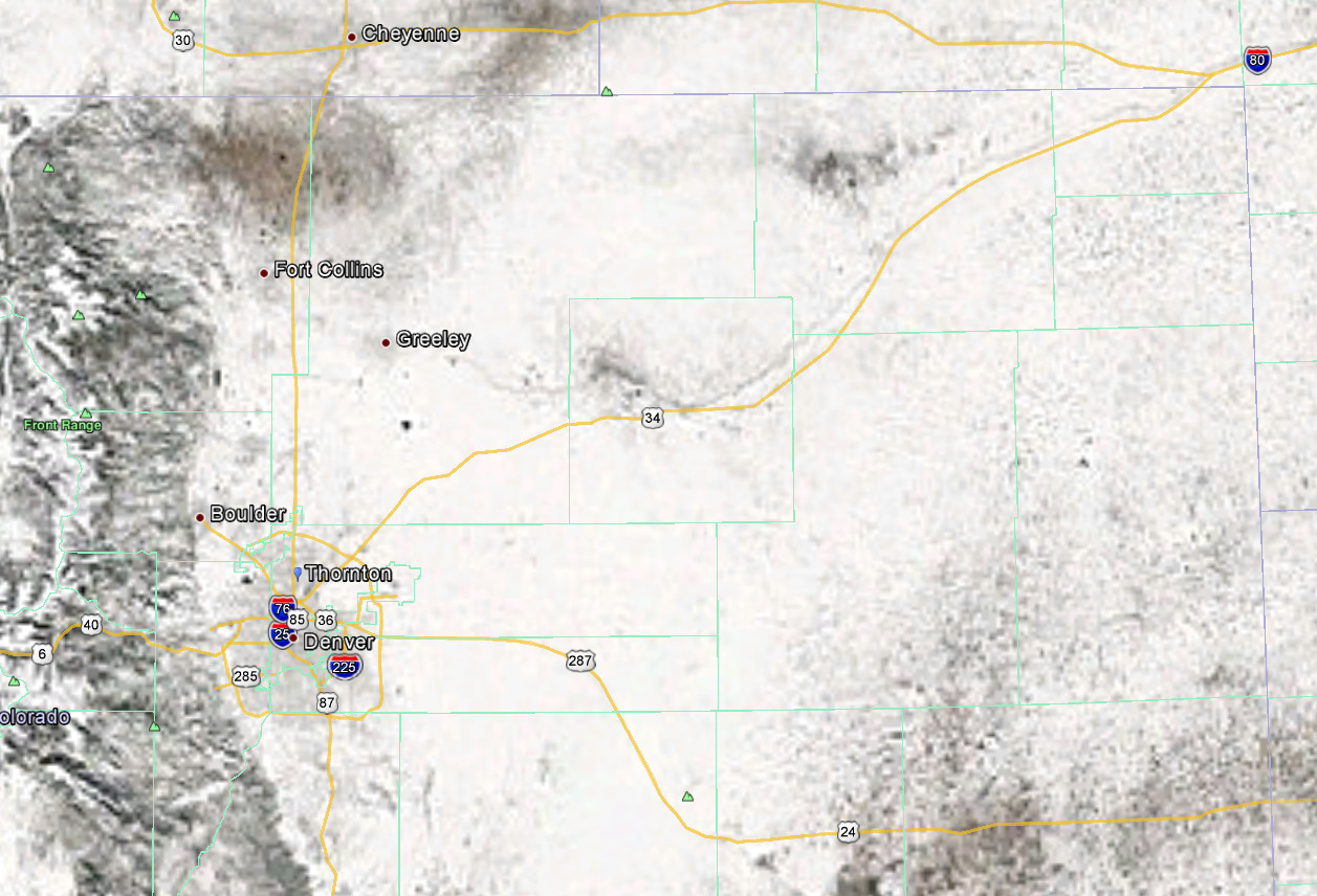 Up until the past week satellite imagery of northeastern Colorado was relatively boring – and very brown. In the wake of two storms, one of which was relatively significant, the image from the eyes in the sky changed considerably.