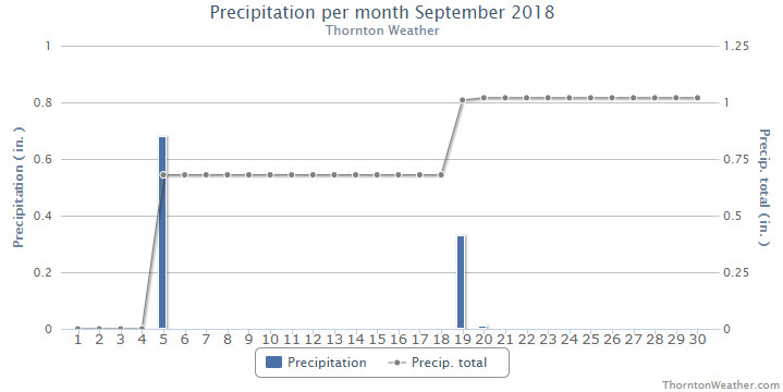 Thornton, Colorado’s September 2018 temperature summary. (ThorntonWeather.com)Thornton, Colorado’s September 2018 precipitation summary. (ThorntonWeather.com)