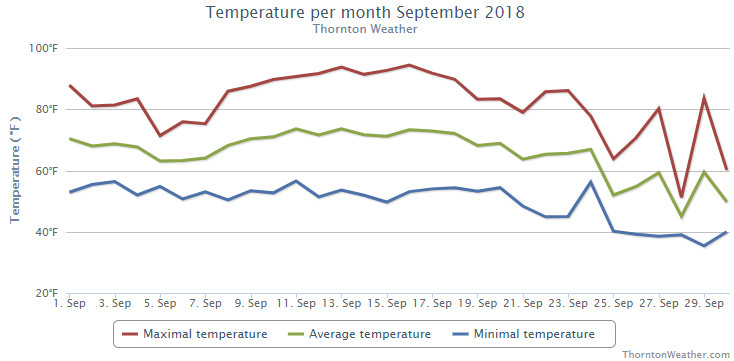 In terms of precipitation, Denver averages 0.96 inches during September. In Thornton, we saw 1.02 inches fall in the bucket with virtually all of that coming on two days. Denver was much drier with only 0.18 inches.