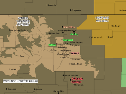 Snow in the mountains tonight will begin to spread to Denver and the Front Range Thursday morning and it will last through Thursday evening and beyond. Highlighting the significance of the storm, the National Weather Service has issued a Winter Storm Warning (see below for text of warning) for all of northeastern Colorado including Denver.