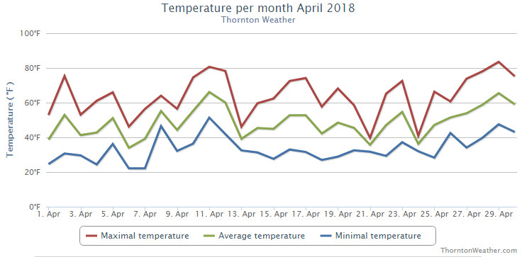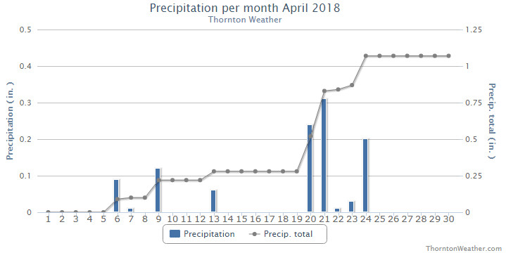 In terms of precipitation, Denver averages 1.71 inches of liquid precip during April Thornton saw only 1.07 inches while Denver was even drier with 0.86 inches.