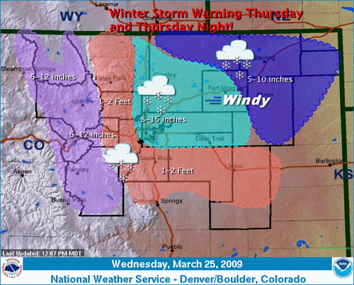 TOTAL SNOW ACCUMULATIONS BY LATE THURSDAY NIGHT WILL RANGE FROM 8 TO 16 INCHES IN THE I-25 URBAN CORRIDOR AND ACROSS SOUTH PARK…AND FROM 1 TO 2 FEET IN THE FRONT RANGE FOOTHILLS AND OVER THE PALMER DIVIDE. OVER THE FAR NORTHEASTER PLAINS…SNOWFALL AMOUNTS ARE EXPECTED TO BE CLOSER TO 6 INCHES.