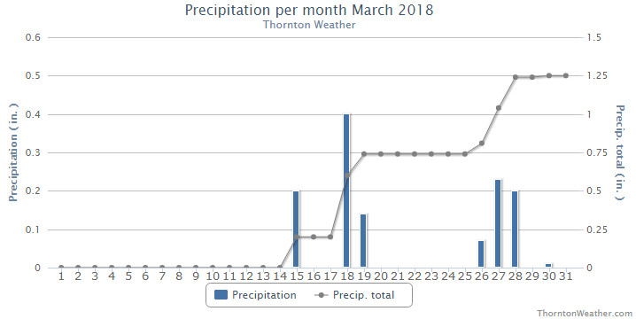 In terms of precipitation, Thornton saw 1.25 inches of liquid precipitation. Denver lagged us with 1.02 inches. Both measurements, however, were above the March long term average of 0.92 inches.