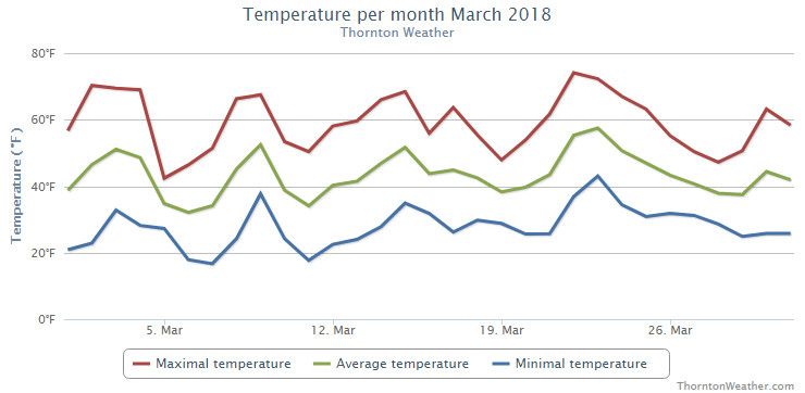 The overall average temperature in Thornton for the month was 42.6 degrees. This was a good bit above Denver’s long term average for the month of 40.4 degrees. In the Mile High City at Denver International Airport where official measurements are kept, a similar average of 42.7 degrees was seen.