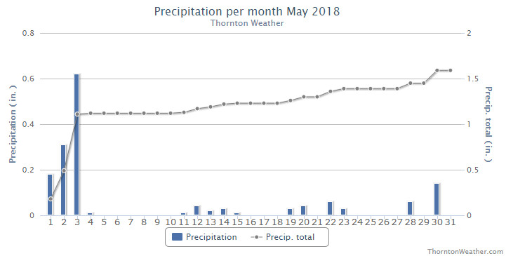 In terms of precipitation, Denver averages 2.12 inches during May. Thornton fell well short with 1.59 inches in our bucket. The Mile High City fared better, but still below normal, with 1.86 inches.