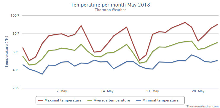 Thornton’s average temperature for the month came in at 60.5 degrees. By comparison, Denver’s long term average temperature for May is 57.1 degrees. Out at the airport where Denver’s official readings are taken, the month’s average temperature was warmer than ours at 61.4 degrees. That made the month the eight warmest May in Denver history.