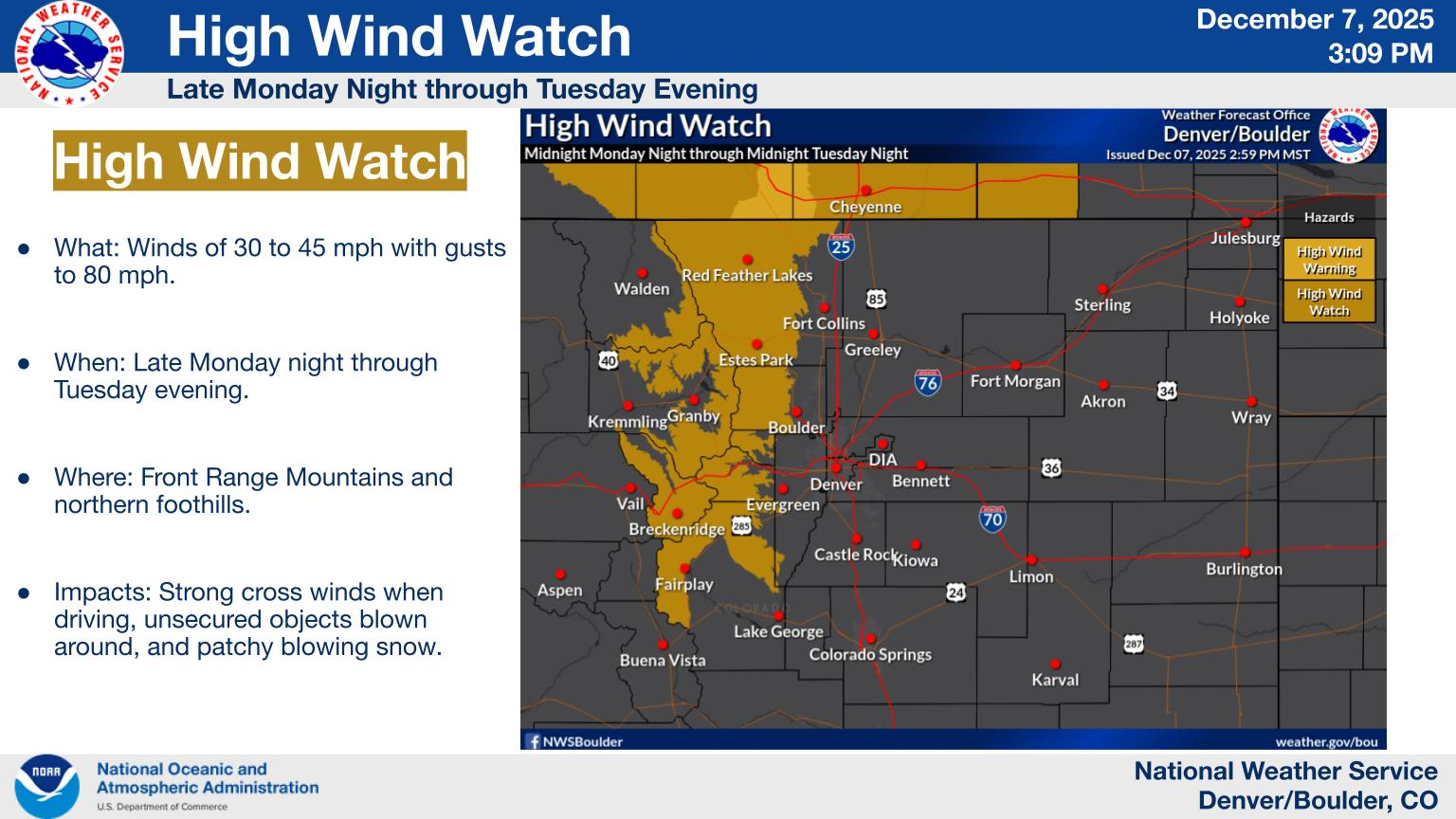 Strong winds are expected to develop late Monday night and Tuesday in the Front Range Mountains and northern foothills with gusts to around 80 mph possible.