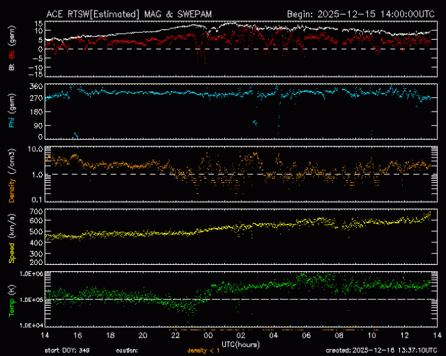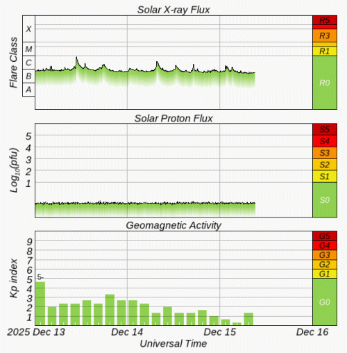 The greatest observed 3 hr Kp over the past 24 hours was 2 (below NOAA Scale levels). The greatest expected 3 hr Kp for Dec 15-Dec 17 2025 is 3.67 (below NOAA Scale levels).